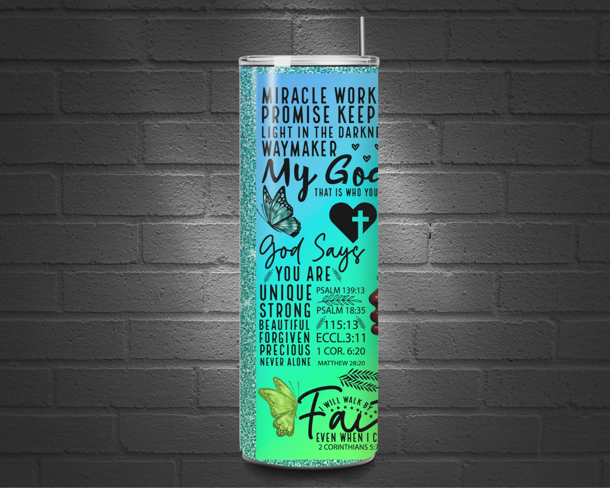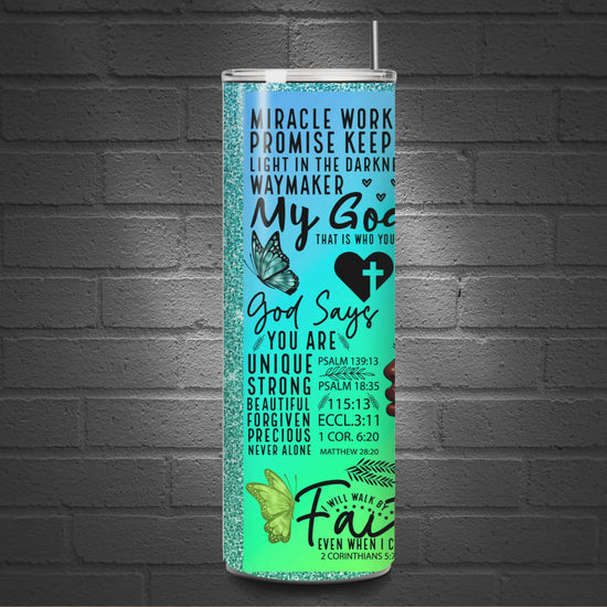 Blessed Woman Tumbler featuring colorful butterflies and various scriptures.