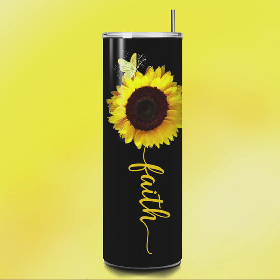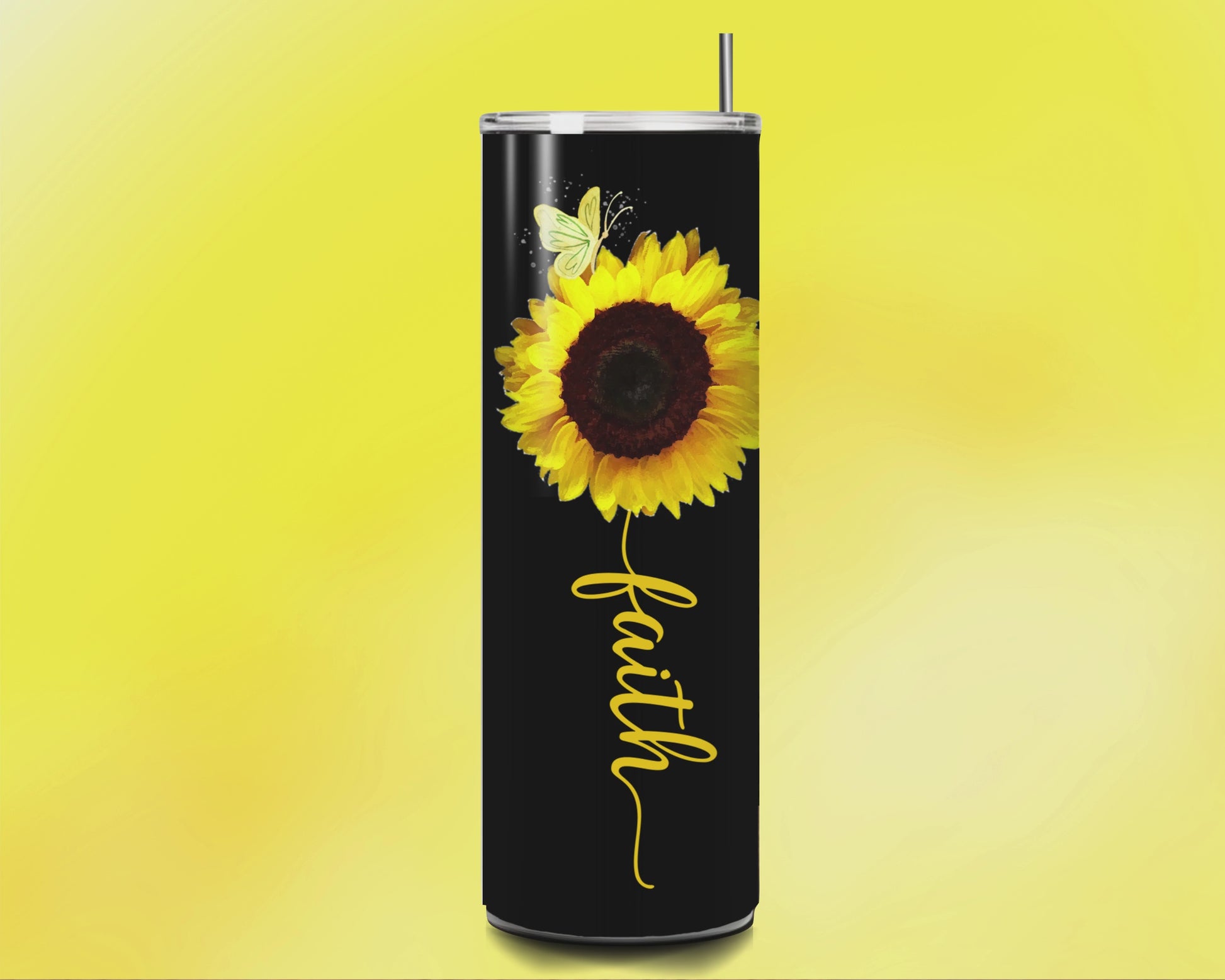 This "Faith, Hope, Love" sunflower tumbler embodies positivity with its vibrant yellow and black design, featuring sunflowers and butterflies. Let this tumbler be a daily reminder to have faith, remain hopeful, and spread love.