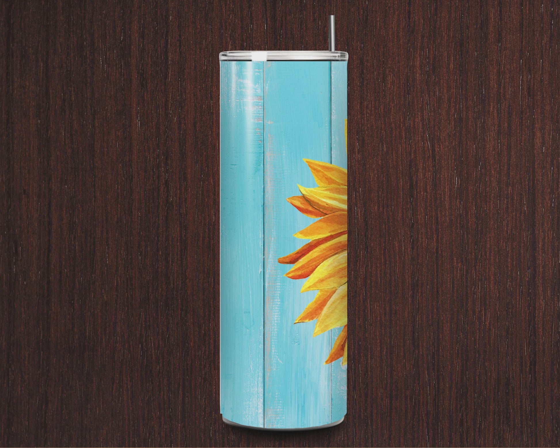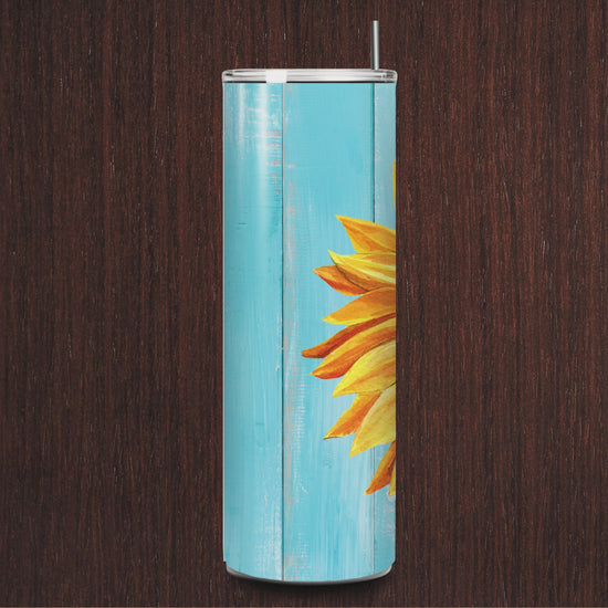 This premium tumbler features an artistic composition of a vibrant yellow sunflower with "FAITH" prominently integrated across its bloom, all contrasted against a weathered rustic blue background. The design harmonizes spiritual symbolism with natural imagery, creating a visually striking effect. Constructed with superior insulation technology, this thoughtfully crafted vessel preserves beverage temperature while offering a daily touchstone of inspiration and unwavering belief.