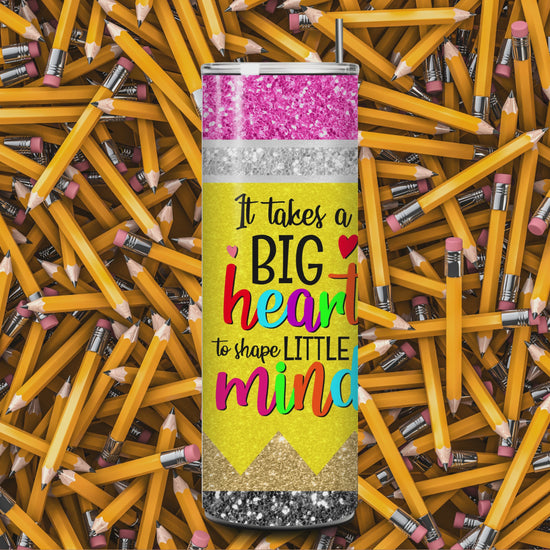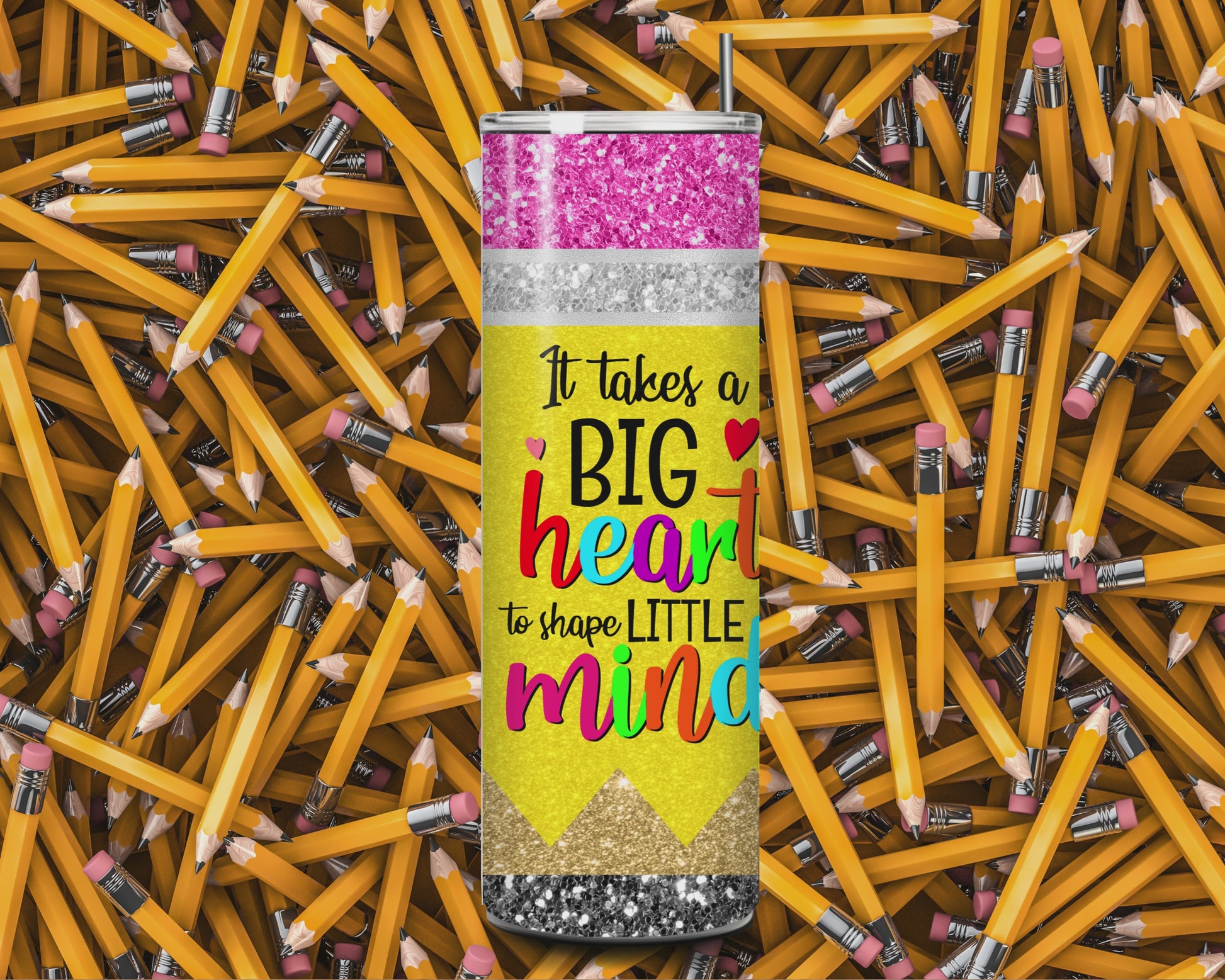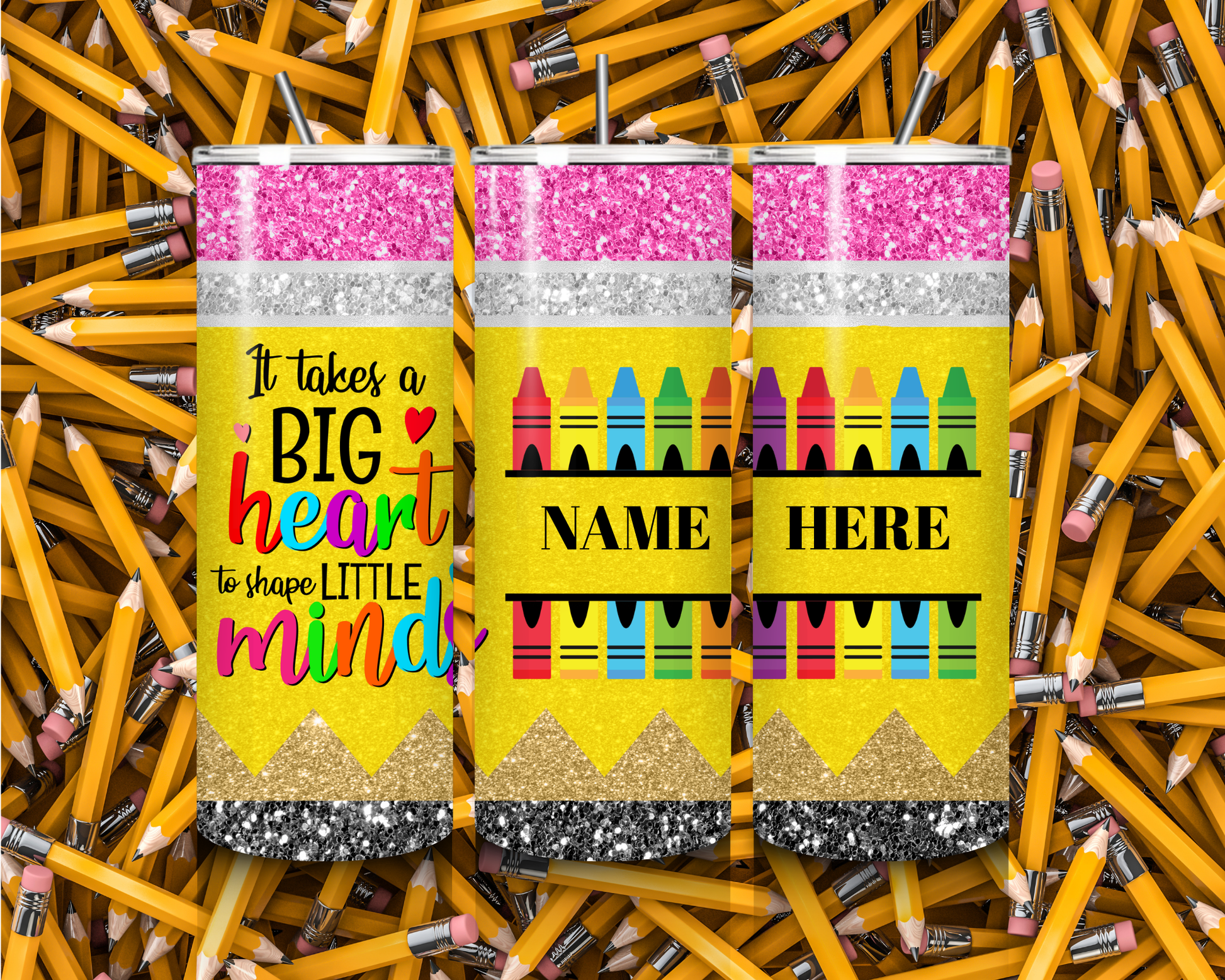 Enhance your favorite teacher's daily routine with our "It Takes a Big Heart" Personalized Teacher Tumbler. This sleek tumbler features a charming design of bright crayons on a big pencil, with the heartfelt message "It Takes a Big Heart to shape little minds". Customize it with the teacher's name for a thoughtful and practical gift.